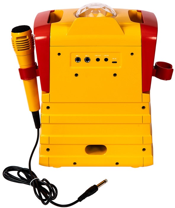 Kompaktes, tragbares Karaoke-System im farbenfrohen „Yellow Submarine“-Design / Integrierter Bluetooth®-Empfänger / USB-Anschluss zur Aufnahme und Wiedergabe / Anschluss für MP3-Player, Smartphone oder Tablet / Tablet-Halterung / LED-Anzeige / Mehrfarbige LED-Lichtshow & Disco-Ball-Lichteffekte / Echoeffekt / Separate Lautstärkeregelung für Lautsprecher und Mikrofone / 2 dynamische Mikrofone / 2 Mikrofonhalterungen / 2 Mikrofon-Eingänge / USB-Eingang & Aux-Line-In / Integrierter Akku mit USB-C-Ladeanschluss (inkl. 1 m Ladekabel) / Automatische Abschaltung.