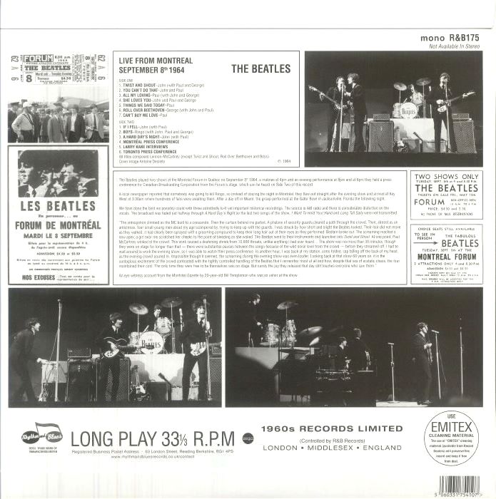 Diese Mono-Vinyl-LP dokumentiert den legendären Auftritt der Beatles am 8. September 1964 in Montreal während ihrer ersten Nordamerika-Tournee. Ergänzt wird das Live-Set durch zeitgenössische Pressekonferenzen und Backstage-Interviews, die einen authentischen Einblick in die Atmosphäre der Beatlemania in Kanada geben.